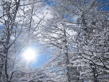 綿帽子をかぶった枝に差し込む太陽