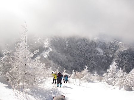 青空の下、雪の森の楽しいスノーハイキングが続く
