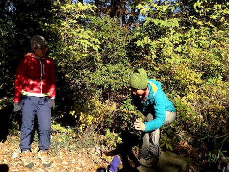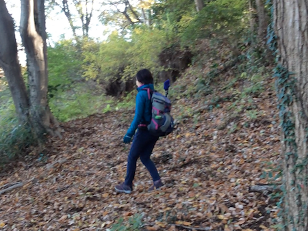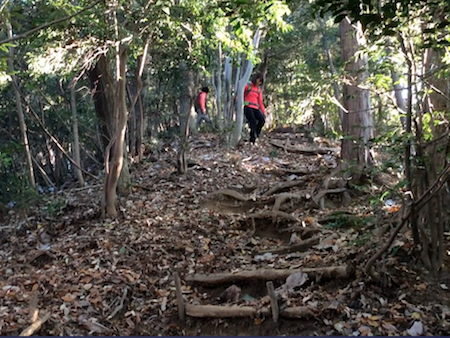 枯れ葉で滑りやすい急な下りは