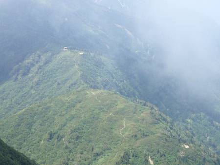 右手の三俣蓮華岳と左手の鷲羽岳のコルにある三俣山荘